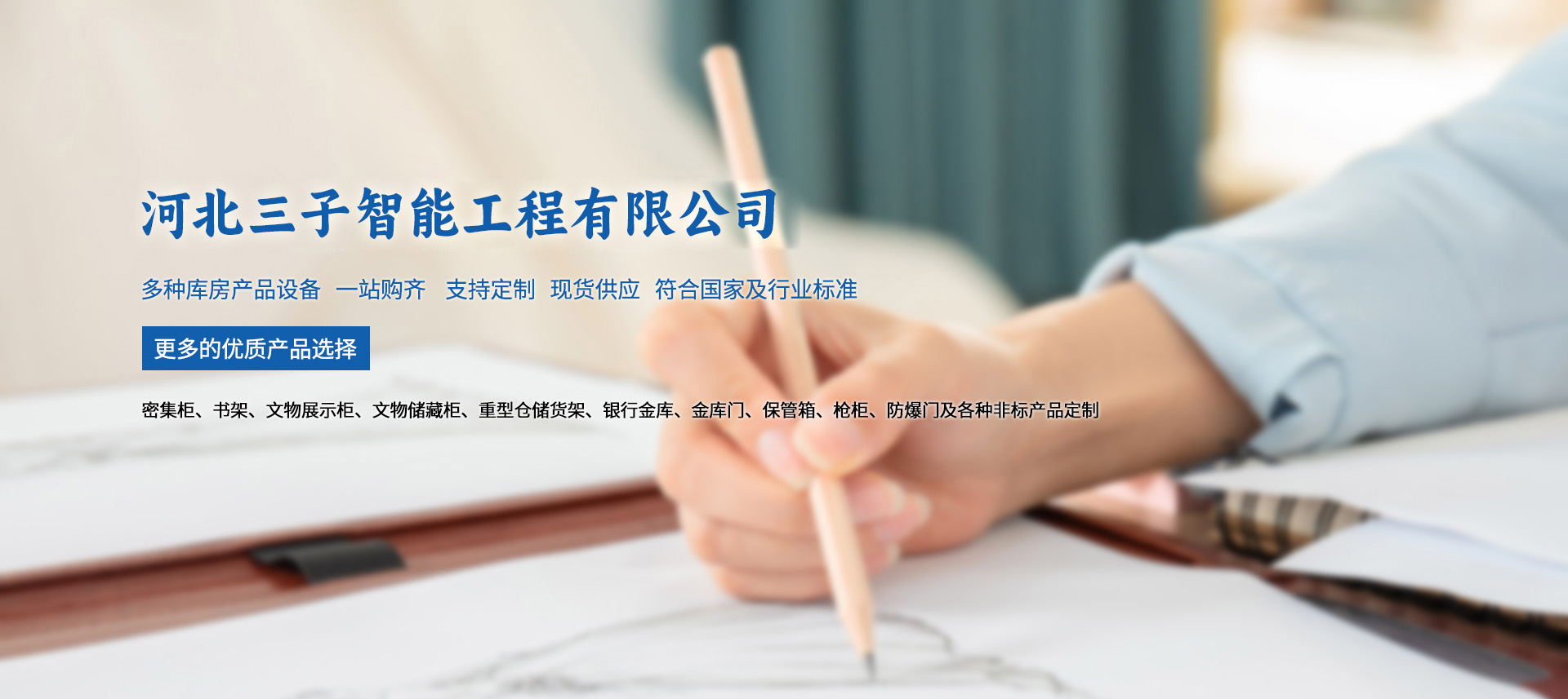 河北三子智能工程有限公司主營密集柜、書架、文物展示柜、文物儲藏柜、重型倉儲貨架、銀行金庫、金庫門、保管箱、槍柜、防爆門及各種非標產品定制。我們集研發,設計,生產,銷售和服務于一體,擁有國內先進的設備和專業的制作團隊,我們秉承踏實,創新,責任的企業精神服務于檔案存儲,倉儲物流,農業部,博物館,美術館,銀行,部隊,學校等多個領域,我們始終堅持用戶至上和精益求精為客戶提供優質的產品及服務。